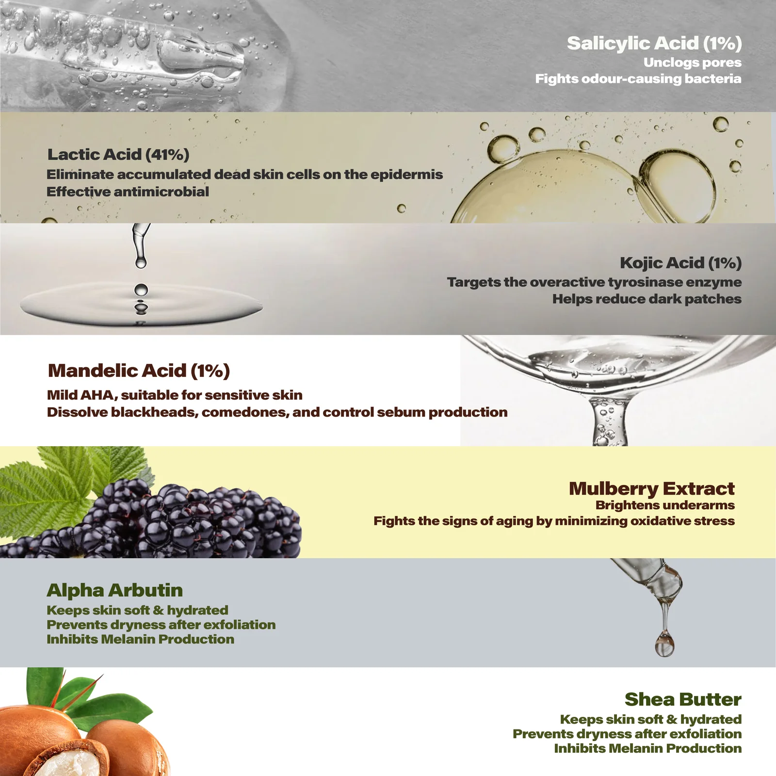 Powered with Lactic acid (4%), Mandelic acid (1%), Kojic acid Dipalmitate (1%), Salicylic acid , Mulberry extract, Antimicrobial, Created with Dermatologist, Dermatologically Tested, Non Comedogenic, FDA approved Safe Ingredient